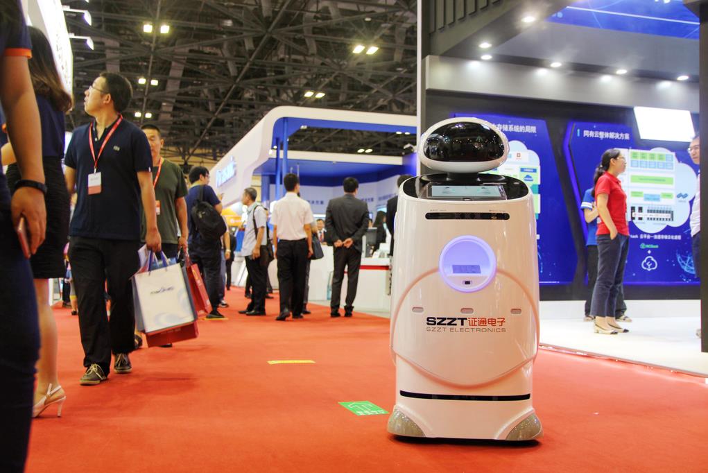 7月27日上午9點,中國人民銀行副行長范一飛宣布展覽正式開幕,開館后,證通展廳陸續圍滿了前來參觀的觀眾。本次展會證通帶來了金融領域不同板塊的業務展示,展廳分為聚合支付、IDC及云計算、機器互聯云、智慧銀行四大展示區,通過現場設備演示以及生動的產品講解,向觀眾展示證通在金融領域的業務實力。本次展會證通還頗有誠意的帶來了銀行服務機器人、“微信存取款”智慧柜員機兩大產品設備的首秀,并成為全場矚目的焦點之一。