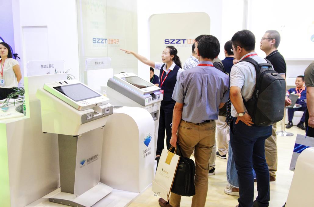 本次展會,證通電子特邀杭州銀行參與展示,并為其設定了專門的智慧銀行設備展示區域,展會過程中,杭州銀行展示區人流不斷,觀眾們紛紛駐足觀看杭州銀行智慧網點的演示視頻,并饒有興趣地向現場工作人員了解設備的優勢特點。