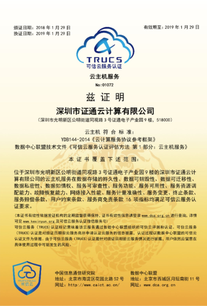 2018年2月1日,中國信息通信研究院正式發布了2017年下半年第九批通過可信云認證的名單。證通云主機服務順利通過可信云云主機服務認證。