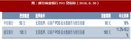 而從POS貸的業務特點看,放款效率高,抵押條件低,是對于缺少抵押產品的小微商戶最方便的融資方式,而從其融資成本看,若參照一般商業銀行的指導來看,根據商業銀行的官網通知來看,其規范的指引年化利率一般控制在20%以內。不過,傳統POS貸由于征信的維度單一,且資金流造假存在不確定性,因此自2016年下半年開始,根據好貸網等專業金融資訊網站的統計,銀行對小微貸趨向謹慎,住房按揭和政府項目是貸款主方向。